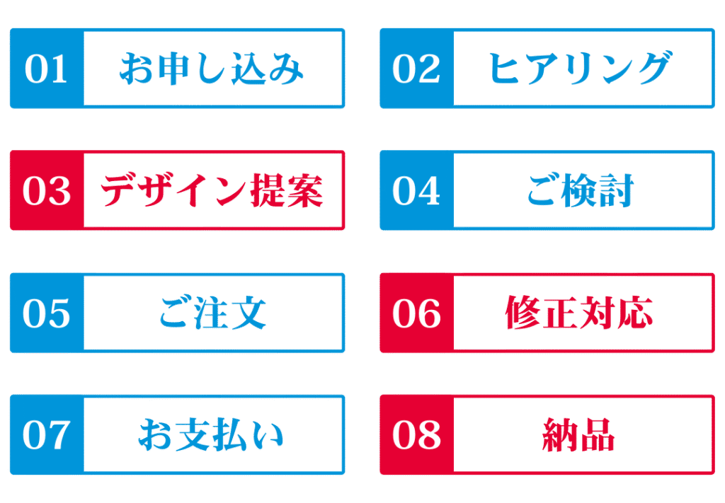 お客様お申し込み▶お客様ヒアリング▶当店デザイン提案▶お客様ご検討▶お客様ご注文▶当店修正対応▶お客様お支払い▶当店納品